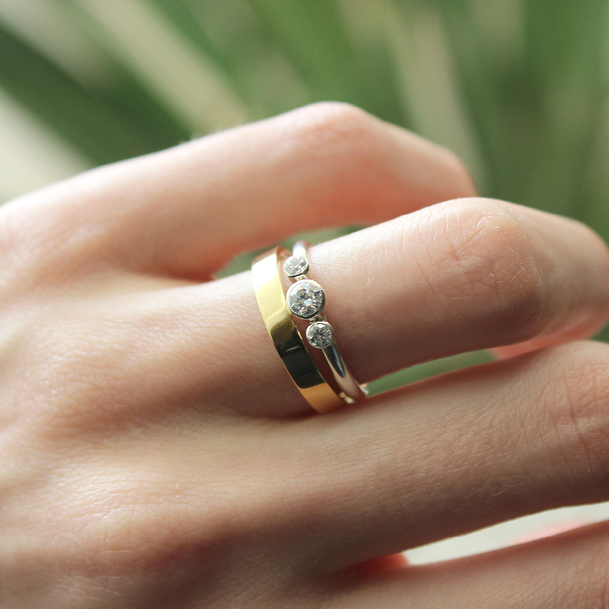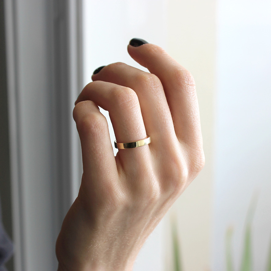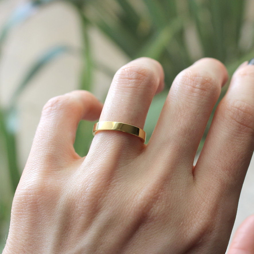 Alianças com aro reto por fora e arredondado (anatômico) por dentro.