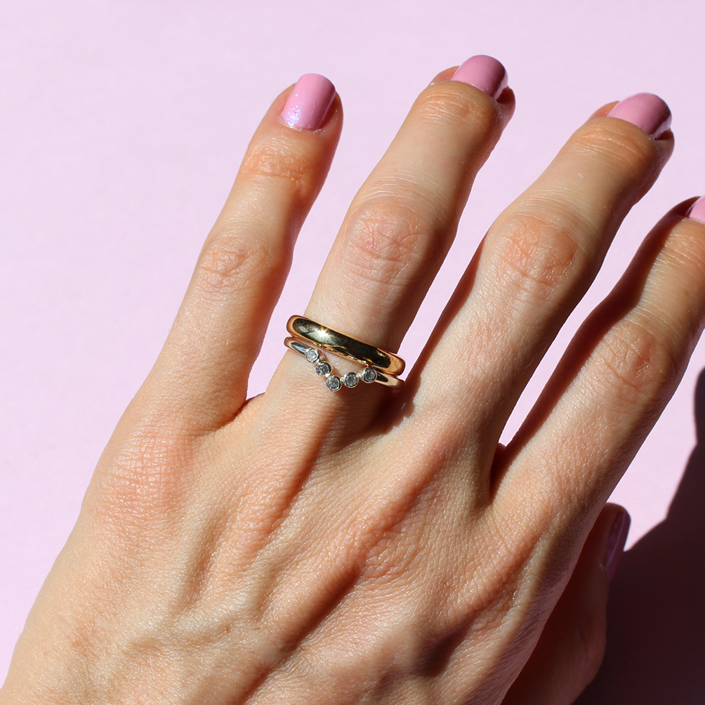 Anel que pode ser usado sozinho e também fica simplesmente maravilhoso quando combinado com outros anéis ou aliança.