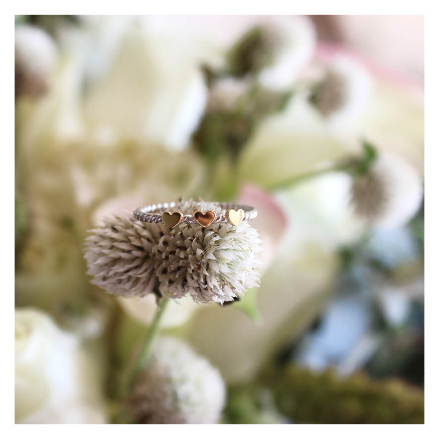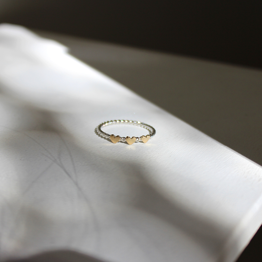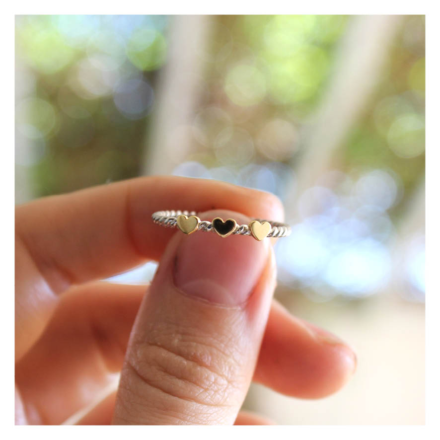 Anel três corações com aro torcido – corações em ouro e aro em prata