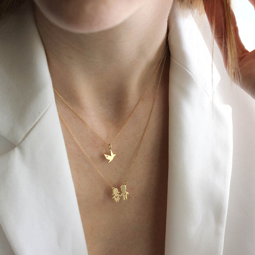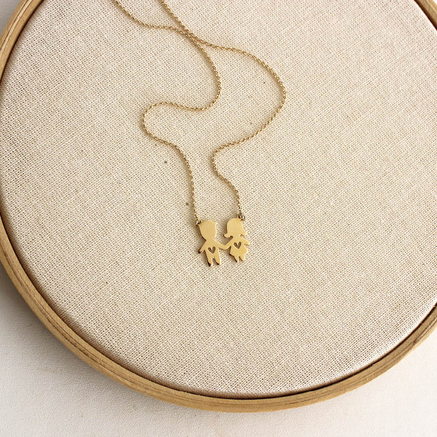 Colar dois filhos de mãos dadas. Joia em ouro amarelo 18k
