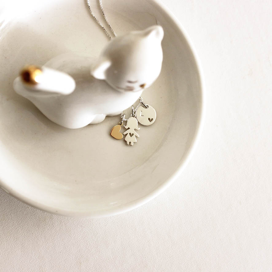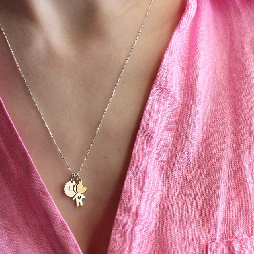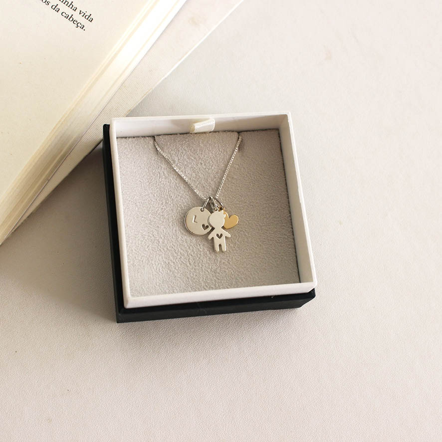 Lindo colar com pingente de filho e de inicial prata com coração em ouro amarelo.