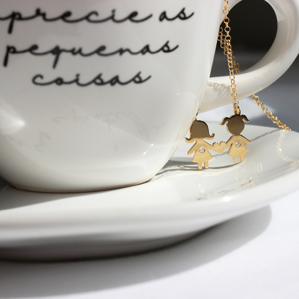 Delicado colar de dois filhos com diamantes cravados no peito.