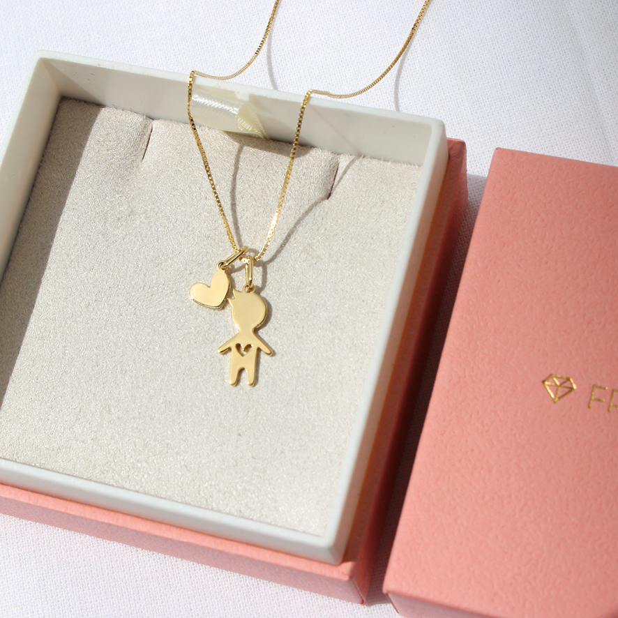 Colar menina/menino + coração em ouro amarelo 18k.