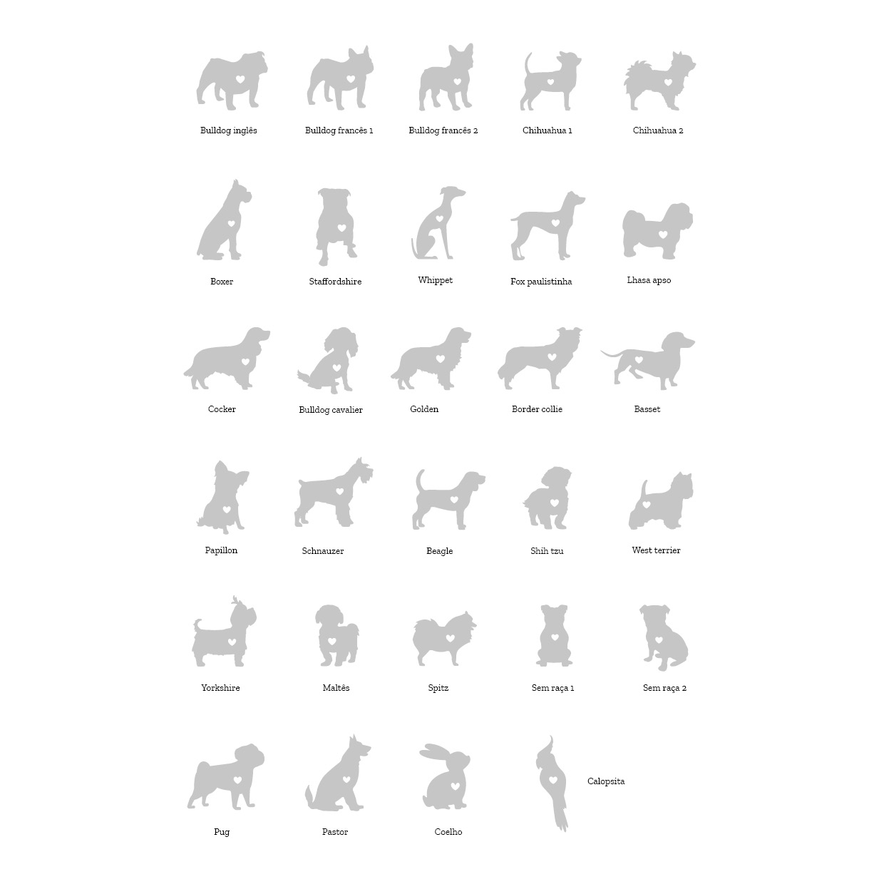 Bulldog inglês, Bulldog francês 1, Bulldog francês 2, Chihuahua 1, Chihuahua 2, Boxer, Staffordshire, Whippet, Fox paulistinha, Lhasa apso, Cocker, Bulldog cavalier, Golden, Border collie, Basset, Papillon, Schnauzer, Beagle, Shih tzu, West terrier, Yorkshire, Maltês, Spitz, Sem raça 1, Sem raça 2, Pug, Pastor, Coelho, Calopsita