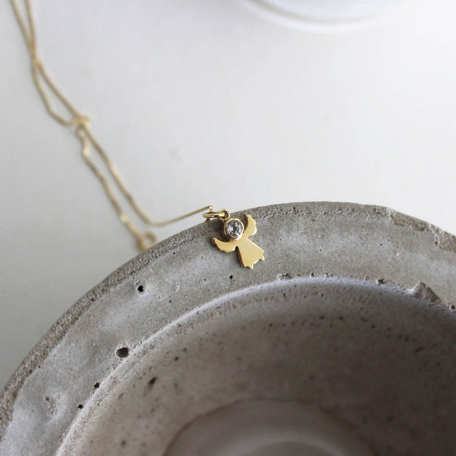 Delicado e especial colar de anjo, feito à mão em ouro amarelo 18k e topázio transparente.