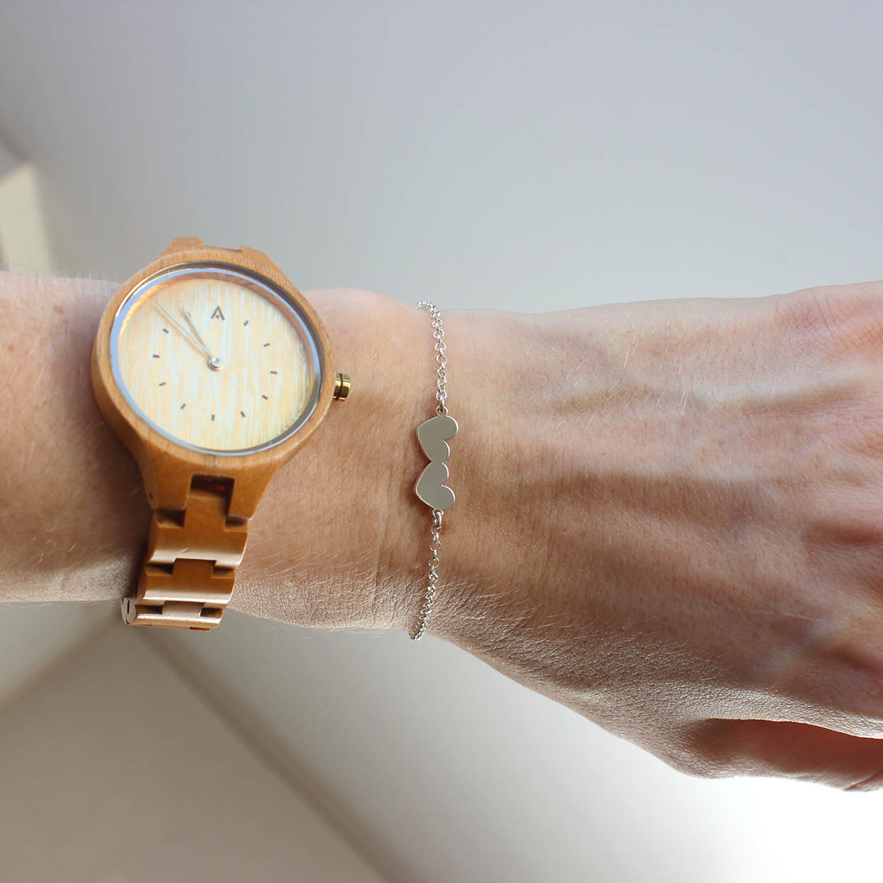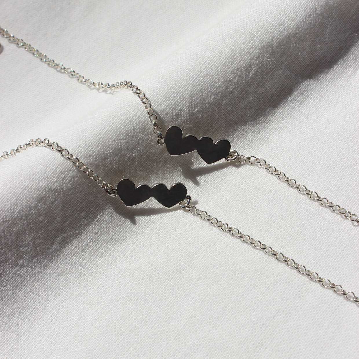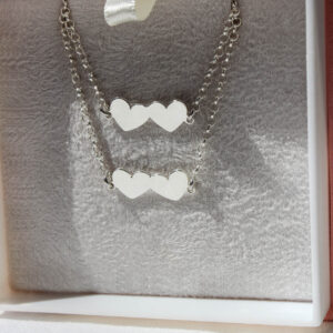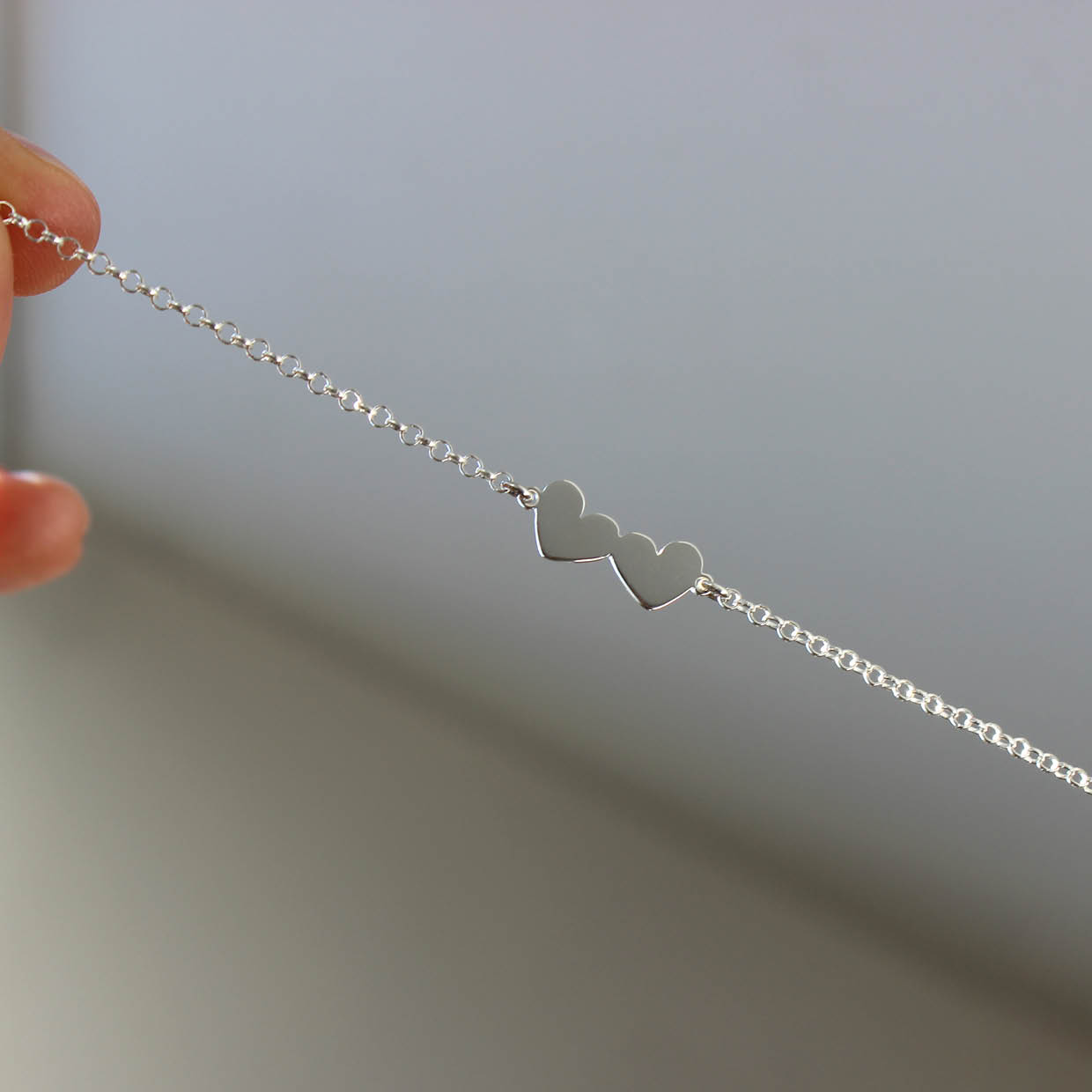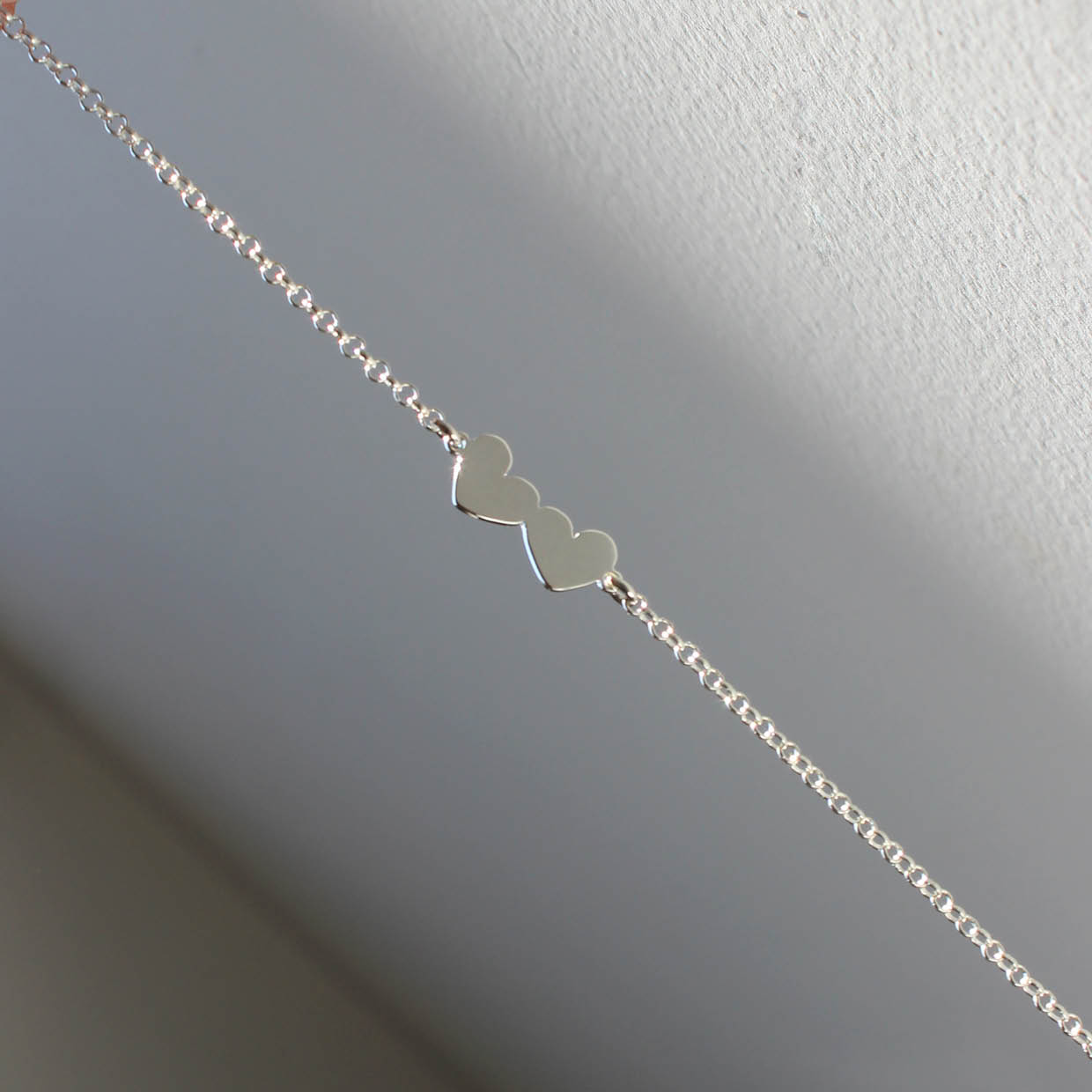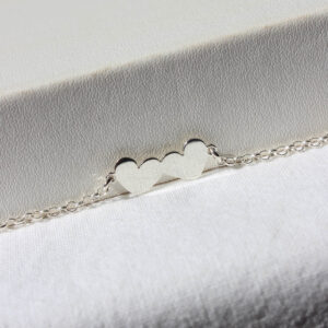 Delicada pulseira com dois corações em prata 960. Joia feita à mão.