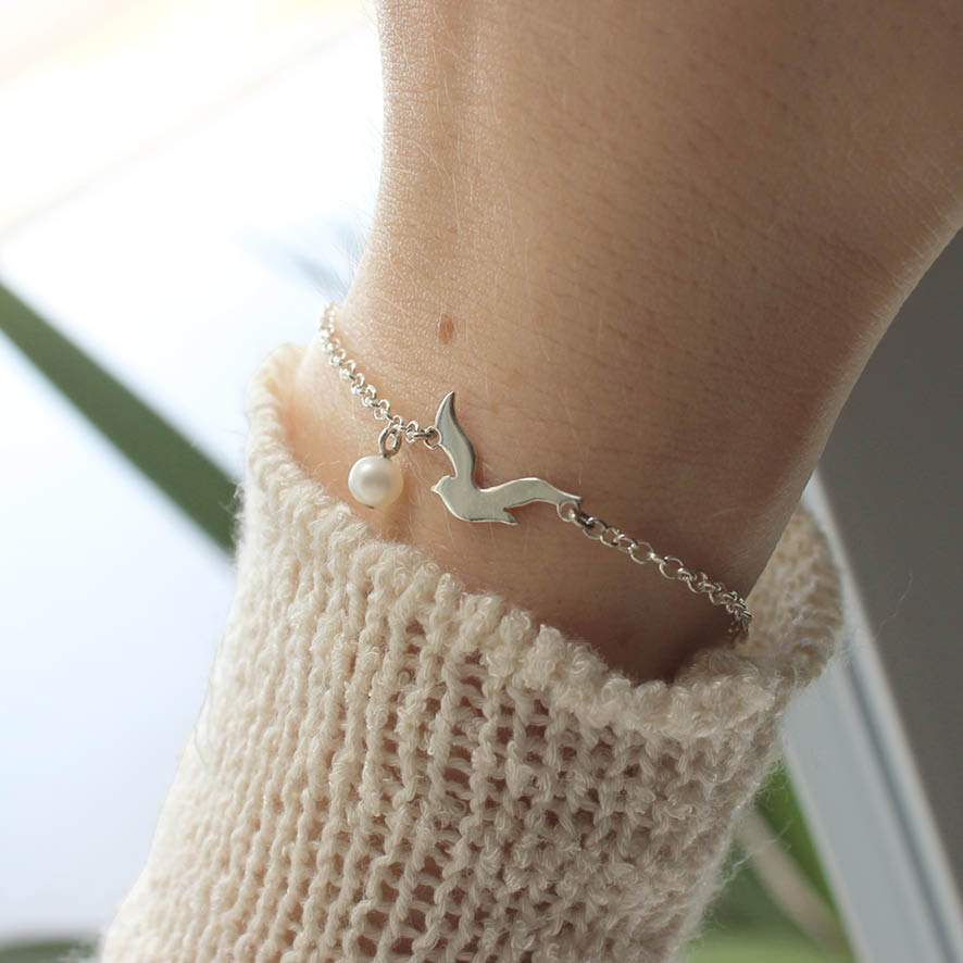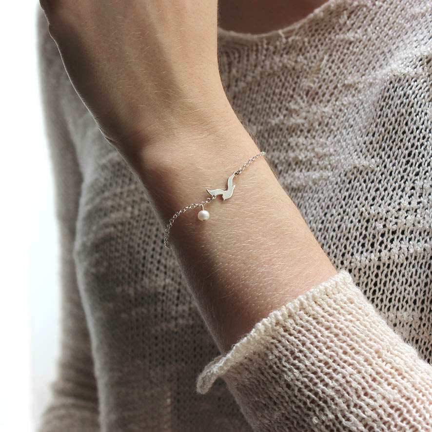 Delicada pulseira gaivota com pérola de água doce. Joia feita à mão em prata 960.